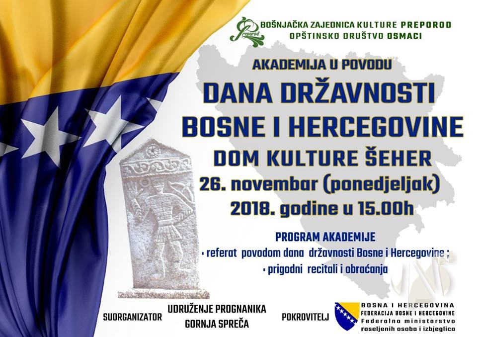 Bošnjačka zajednica kulture “Preporod” i Opštinsko društvo Osmaci organizuju akademiju u povodu Dana državnosti Bosne i Hercegovine.