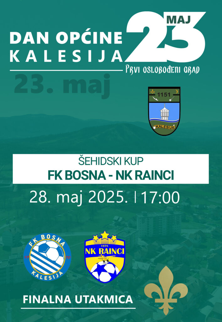U srijedu 28. maja sa početkom u 17:00 sati na Gradskom stadionu u Kalesiji bit će odigrana finalna utakmica Šehidskog kupa u kojoj se sastaju FK “Bosna” Kalesija – NK “Rainci” Rainci Gornji