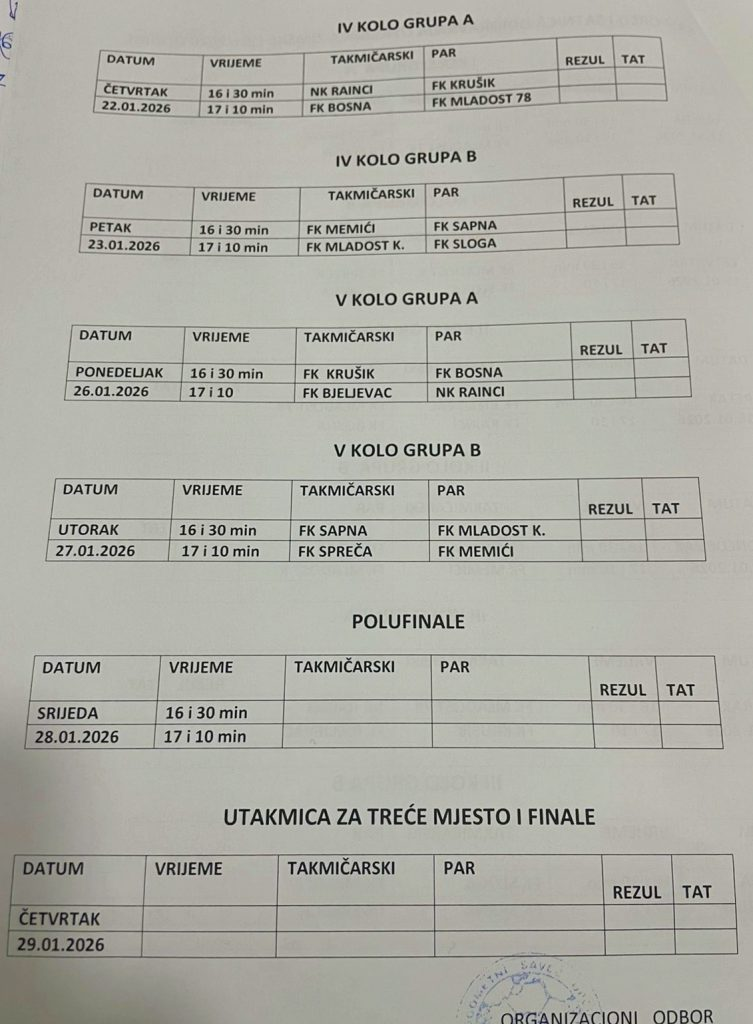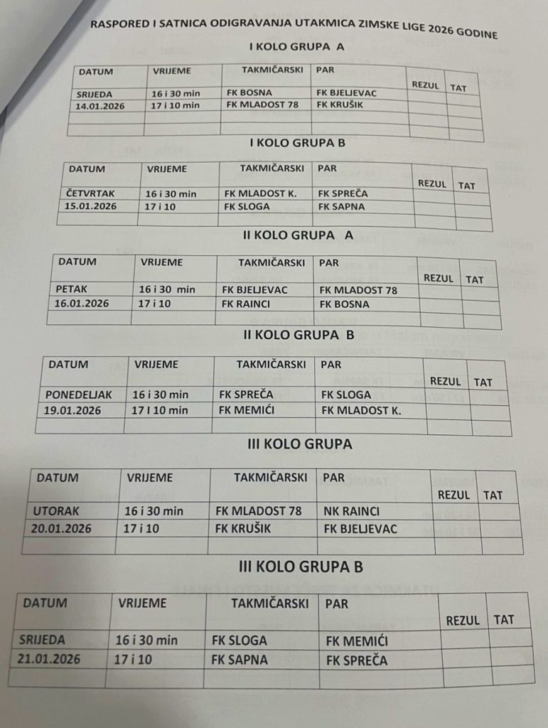 Prva utakmica na rasporedu je u srijedu s početkom u 16:30 sati, a snage će odmjeriti FK Bosna i FK Bijeljevac. Nakon prve utakmice planirano je svečano otvaranje Zimske futsal lige (17:00) poslije kojeg je rasporedu i druga utakmica u kojoj se sastaju FK Mladost 78 i FK Krušik (17:10)