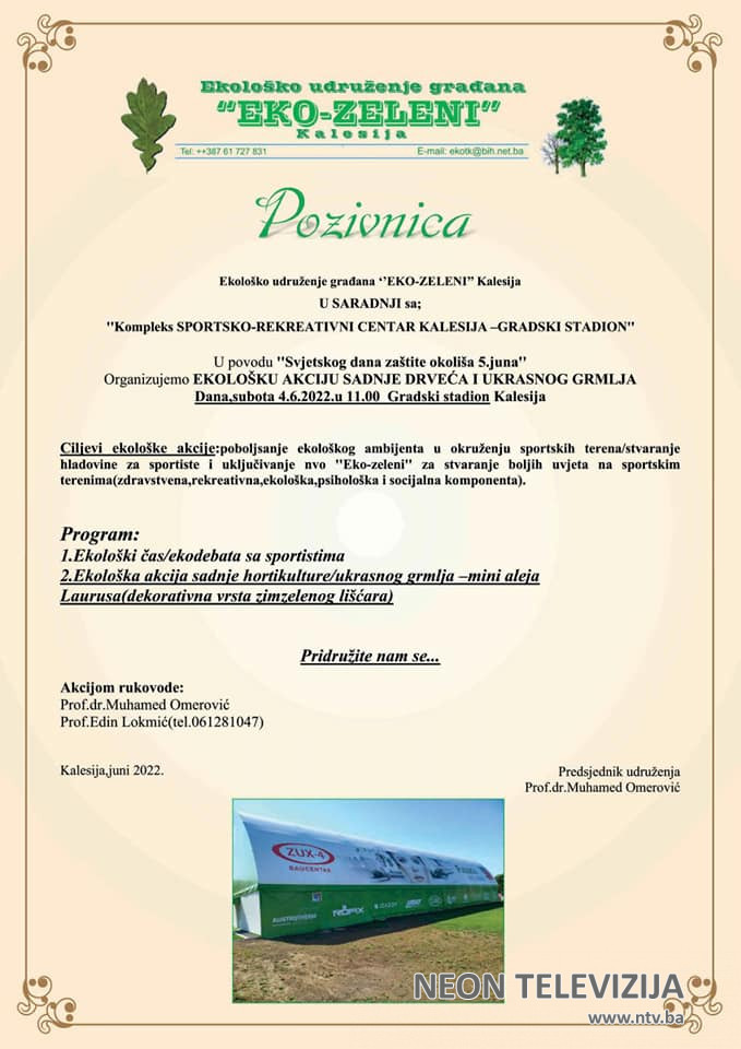 U povodu Svjetskog dana zaštite okoliša “Eko-zeleni” Kalesija i FK “Bosna” Kalesija organizuju u subotu, 4. juna 2022. godine ekološku akciju sadnje drveća i ukrasnog grmlja.