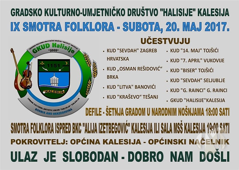 U povodu obilježavanja Dana općine Kalesija Gradsko kulturno umjetničko društvo „Halisije“ Kalesija organizuje IX smotru folklora Kalesija 2017. godine u subotu 20. maja 2017. godine sa početkom u 19:00 sati ispred BKC „Alija Izetbegović“ Kalesija ili u sali MŠS Kalesija.
