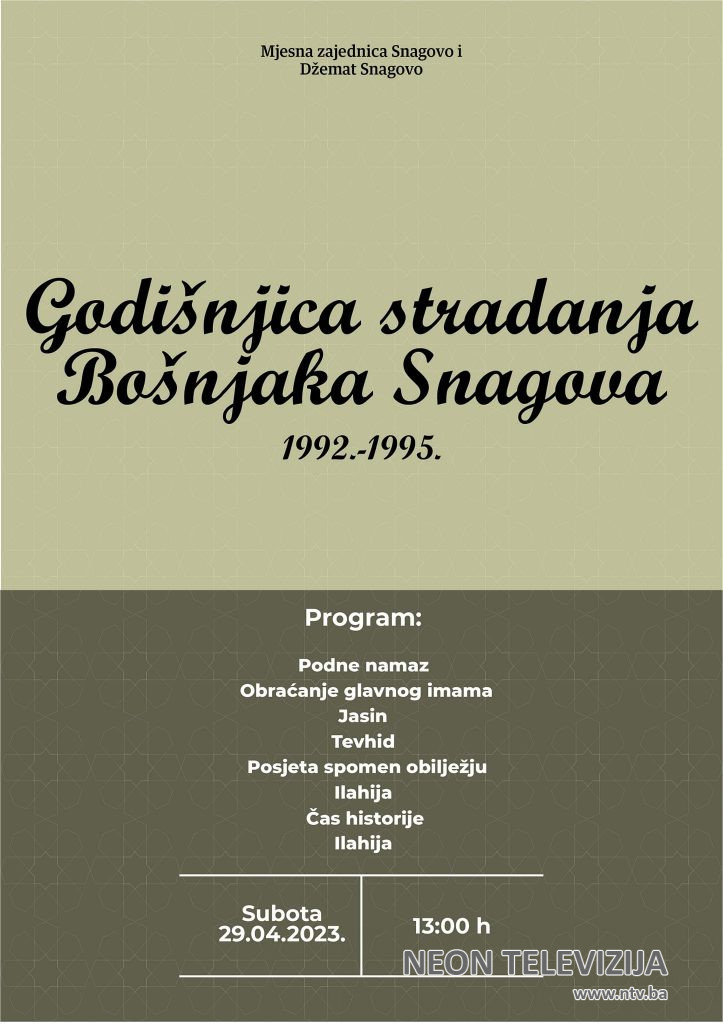 Savjet MZ Snagovo u saradnji sa džematom Snagovo i porodicama stradalih organizuje u subotu, 29.04.2023. godine, obilježavanje 31. godišnjice stradanja civila u Snagovu.