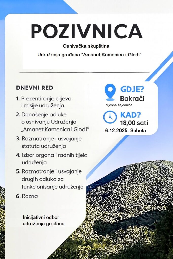 U Bakračima će u subotu, 6. decembra 2025. godine s početkom u 18:00 sati, biti održana Osnivačka skupština Udruženja građana „Amanet Kamenica i Glodi“.