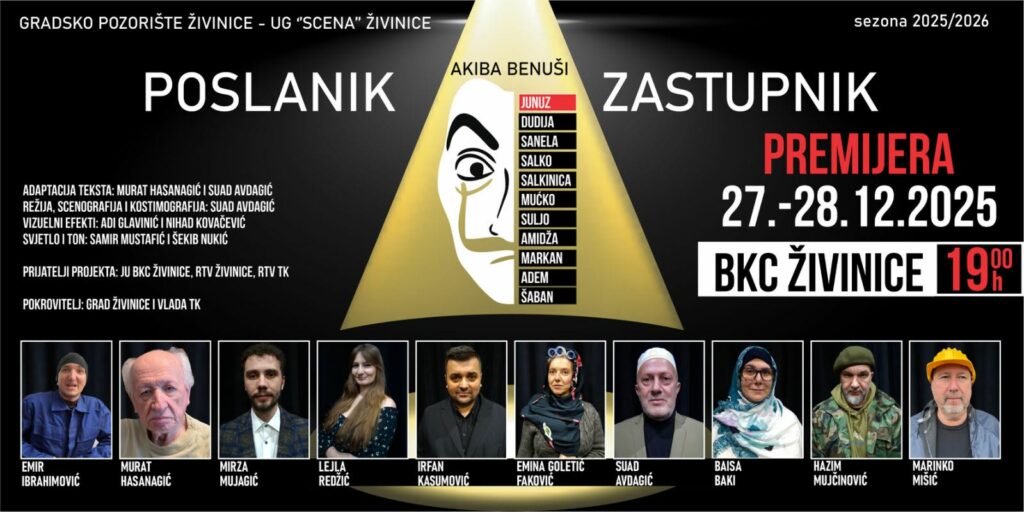 Velika sala JU BKC Živinice u subotu, 27. decembra 2025. godine, s početkom u 19 sati, bit će domaćin premijerne izvedbe predstave „Poslanik – Zastupnik“, snažne i angažovane teatarske priče koja bez zadrške govori o društvu u kojem živimo, a koja je nastala u produkciji u produkciji UG “Scena” Živinice.