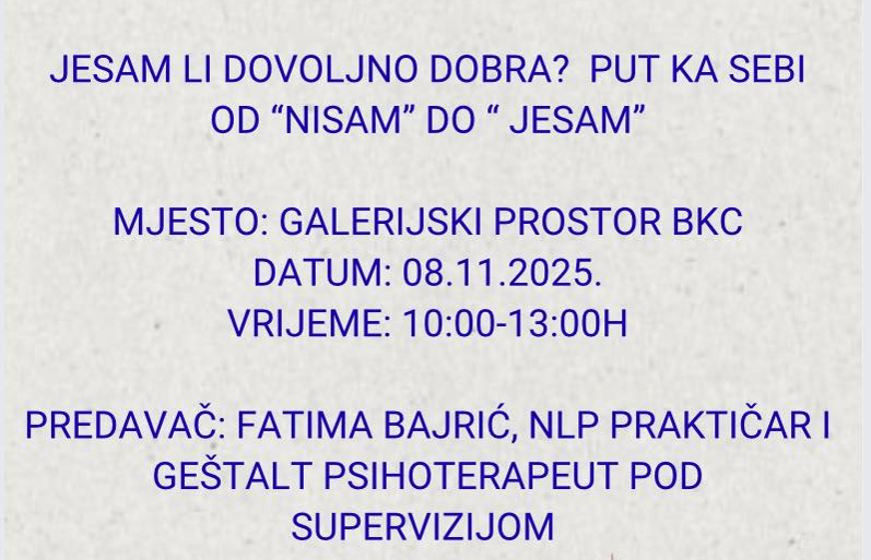 Radionica će se održati u Galeriji JU BKC “Alija Izetbegović” Kalesija 8.11.2025. godine sa početkom u 10:00 sati.