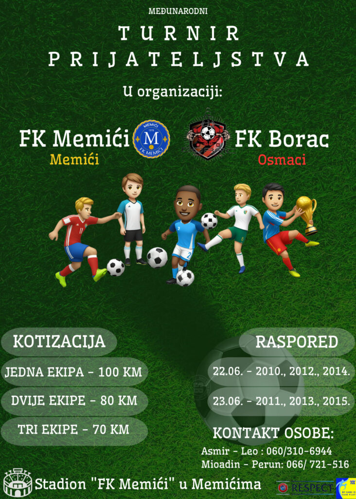 “Obavještavamo sve ljubitelje fudbala da će se održati turnir u malom nogometu za mališane u organizaciji sa našim sportskim prijateljima i komšijama, ekipom FK Borac Osmaci. Ovo je treći po redu turnir koji organizujemo zajedno, čime nastavljamo međuentitetsku saradnju te želimo pokazati da se fudbal prije svega igra iz ljubavi, druženja i prijateljstva.” piše na stranici FK “Memići”.