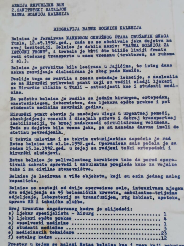 Maj je sinonim za buđenje, rađanje. Cvjetanje. Sve miriše na behar. Poljsko cvijeće. Maj je sve to ali i maj je, posebno u Kalesiji, jedan od najtužnijih mjeseci. Maj je u Kalesiji i sinonim za otpor. Hrabrost. Ponos. Rađanje inata bosanskog. Onog što neprijatelju nije dao domovinu. Maj je mjesec kada su emocije uzburkane. Na vrhuncu. Kada su nam oči pune suza ali i srce puno ponosa. U maju je okupirana Kalesija. U maju je oslobođena Kalesija. Postala je prvi oslobođeni grad u Bosni i Hercegovini. U maju se desio stravičan zločin. Ljudi zarobljeni i živi zapaljeni u štali. U maju se desila i bitka na Bijeljevcu, gdje su najhrabriji sinovi zaustavili neprijatelja. Poremetili mu planove i zasigurno promijenili tok rata u Bosni i Hercegovini. U narednim danima fotografijama i tekstovima prisjetit ćemo se događaja iz perioda 1992.-1995.godina. Shodno tome donosimo tekst o ratnoj bolnici (tekst preuzet iz Spomen sobe)