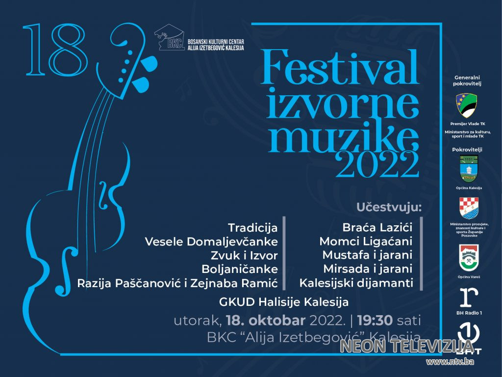 Pozivamo sve ljubitelje izvorne muzike kao i baštinike naše kulture i tradicije na 18. Festival izvorne muzike u Kalesiji, u utorak 18. oktobra u 19:30 sati.