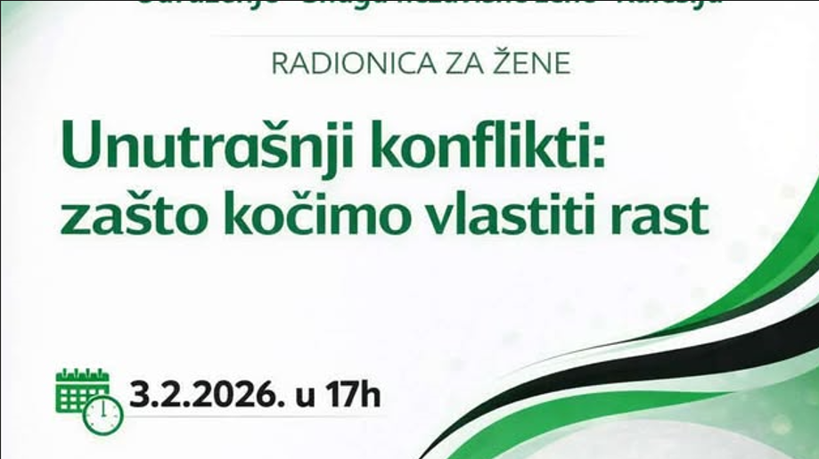 Udruženje “Snaga nezavisne žene” nastavlja sa aktivnostim planiranim u okviru kampanje “16 dana aktivizma”. U utorak, 3.2.2026. godine u Galeriji JU BKC “Alija Izetbegović” bit će održana radionica za žene: „Unutrašnji konflikti – zašto kočimo vlastiti rast“. Radionica počinje u 17:00 sati.