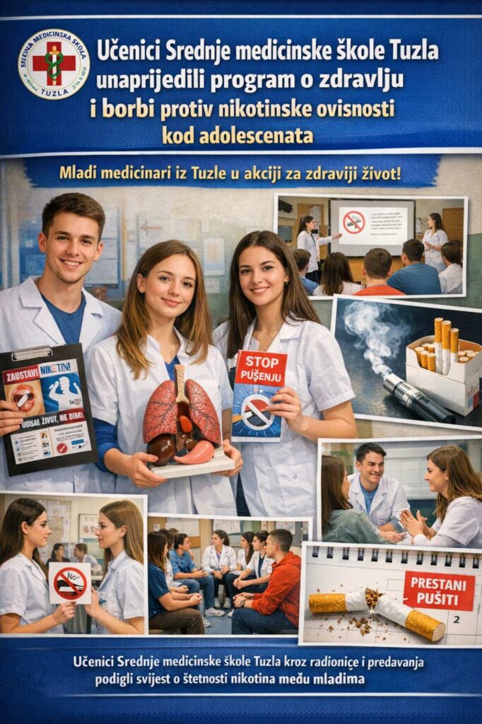 U vremenu kada je upotreba cigareta, elektronskih cigareta I nikotinskih proizvoda među mladima u porastu, učenici Srednje medicinske škole Tuzla pokazali su kako znanje, inicijativa i timski rad mogu donijeti konkretne promjene u zajednici. Kroz projekat usmjeren na unapređenje edukativnog programa o zdravlju, učenici su dali značajan doprinos podizanju svijesti o štetnosti nikotina među adolescentima.
