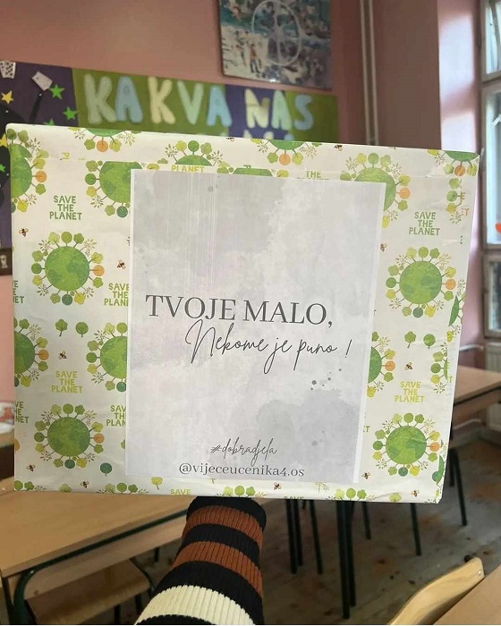 Ispred naše škole možete pronaći i kutiju dobrih djela s porukom “Tvoje malo, nekome je puno!”, gdje možete učiniti jedno dobro djelo donirajući onoliko koliko možete i šta možete učenicima naše škole kojima je to potrebno.