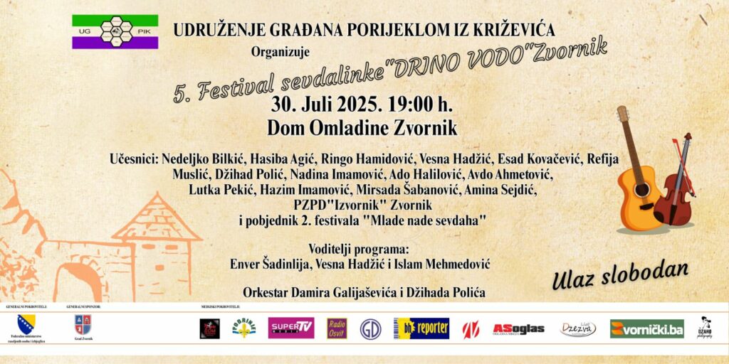 Udruženje građana porijeklom iz Križevića (UGPIK) organizuje 5.festival sevdalinke koji nosi naziv „Drino vodo“, a isti će se održati u Domu omladine Zvornik 30.jula u srijedu s početkom od 19:00 sati .