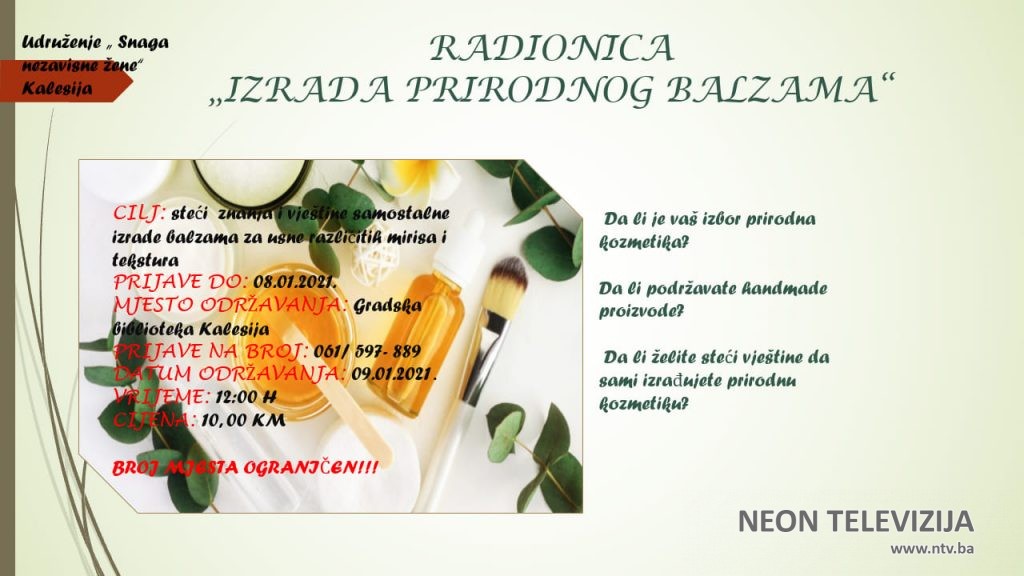 Također na stranici pomenutog Udruženja pozvali su zaintersovane za izradu prirodne kozmetike da im se jave radi organizacije radionice na pomenutu temu. Prijaviti se za radionicu moguće je do 8.1.2021. godine.