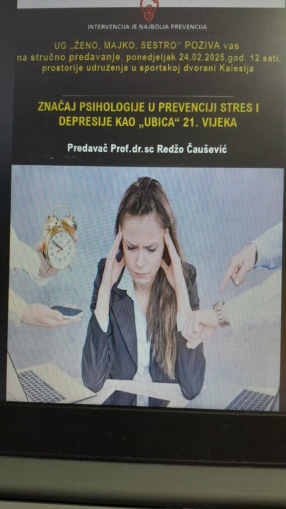 Dvostruko ubistvo u Kalesiji uznemirilo je javnost kako naše općine tako i cijele zemlje. Više se govori o značaju srtučne pomoći, o prevenciji, razgovoru, traženju pomoći, mentalnom zdravlju. Shodno tome Udruženje “Ženo, majko, sestro” organizuje stručno predavanje na temu “Značaj psihologije u prevenciji stresa i depresije kao “ubica” 21. vijeka”. Predavač je prof.dr.sc. Redžo Čaušević.
