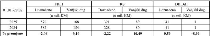 Za finansiranje državnih institucija u prva dva mjeseca 2025. godine raspoređen je iznos od 161 milion KM. Ostatak prikupljenih prihoda od indirektnih poreza završio je kod entiteta i Brčko distrikta. Tako je Federacija BiH sa jedinstvenog računa dobila 775 miliona KM, Republika Srpska 435 miliona KM i Brčko distrikt 43 milion KM.