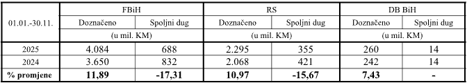 U tablici je prikaz ukupno raspoređenih sredstava entitetima i Brčko distriktu BiH sa pripadajućim spoljnim dugom u periodu januar-novembar 2025. godine u poređenju sa istim periodom prošle godine. Svi iznosi su iskazani u milionima KM.