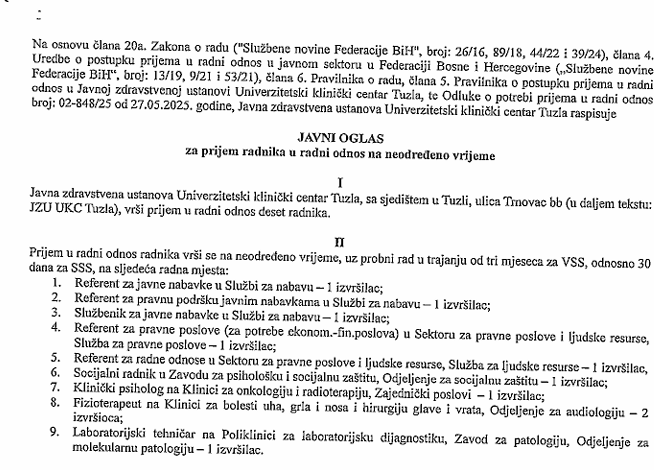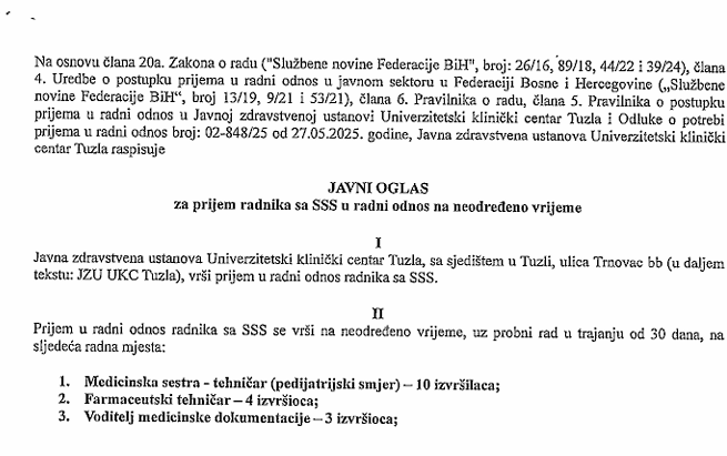 Javna zdravstvena ustanova Univerzitetski klinički centar Tuzla raspisala je dva javna oglasa za prijem radnika u radni odnos na neodređeno vrijeme. Između ostalog, traže se medicinske sestre – tehničari sa srednjom stručnom spremom (SSS), referenti za javne nabavke odnosno radne odnose, socijalni radnik, farmaceutski tehničari…
