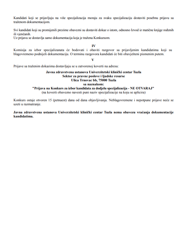 JZU Univerzitetski klinički centar Tuzla raspisala je konkurs za izbor kandidata za dodjelu specijalizacija iz više medicinskih oblasti: