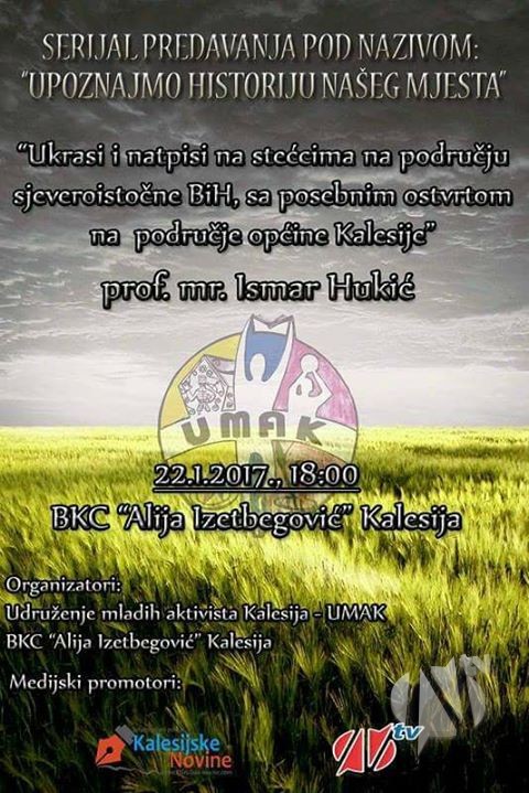 U sklopu serijala predavanja pod nazivom “Upoznajmo historiju našeg mjesta” sutra (nedjelja 22.01.2017.) će se u JU BKC i biblioteka “Alija Izetbegović” Kalesija sa početkom u 18 sati održat predavanje na temu “Ukrasi i natpisi na stećcima na području sjeveroistočne BiH, sa posebnim osvrtom na područje općine Kalesija”.