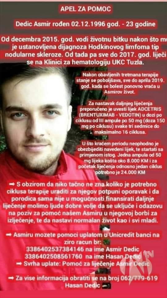 Asmir Dedić od decembra 2015. godine vodi životnu bitku, nakon što mu je ustanovljena dijagnoza Hodkinovog limfoma tip nodularne skleroze. Od tada pa sve do 2017. godine liječi se na Hematološkom odjeljenju UKC-a Tuzla. Nakon obavljenih tretmana terapije stanje se poboljšava, sve do aprila 2019. godine, kada se bolest ponovo vraća u Asmirov život.