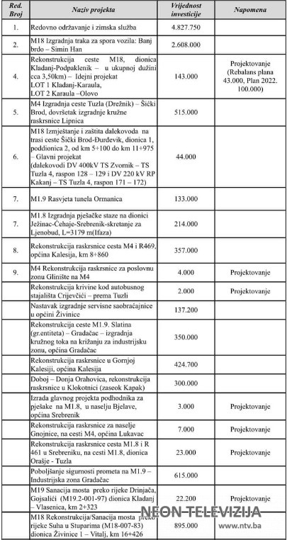 Od planiranih projekata  iznosima se najviše ističu izgradnja traka za spora vozila na dionici Banj Brdo  – Simin Han u vrijednosti 2.608.000 KM, sanacija asfaltnog kolovoza na cesti Donja Orahovica – Šićki Brod (1.530.000 KM), te sanacija asfaltnog kolovoza na cesti Šićki Brod – Živinice – Vitalj (1.550.000 KM).