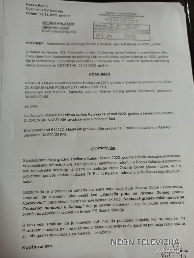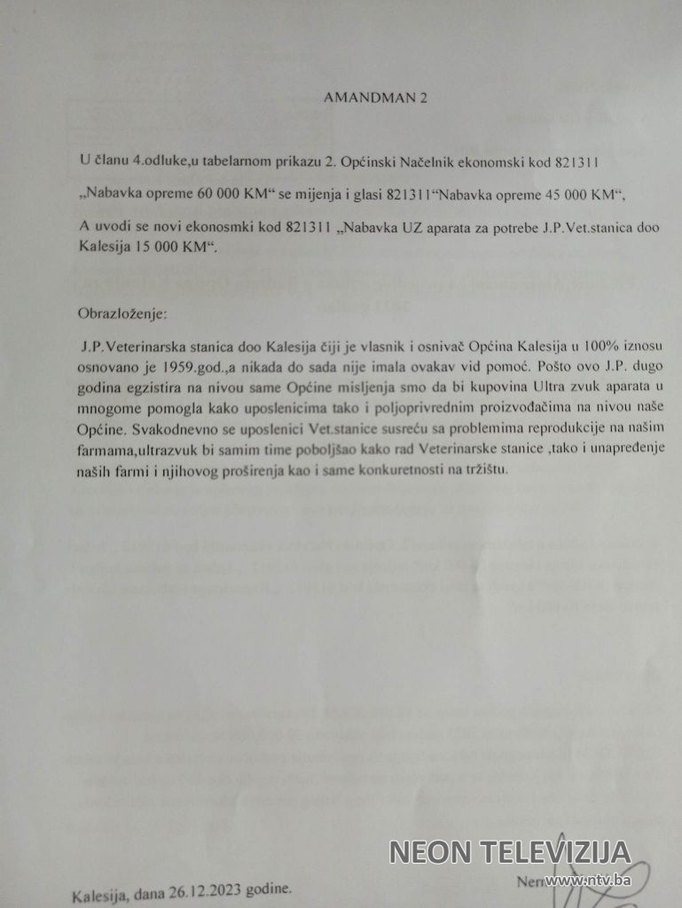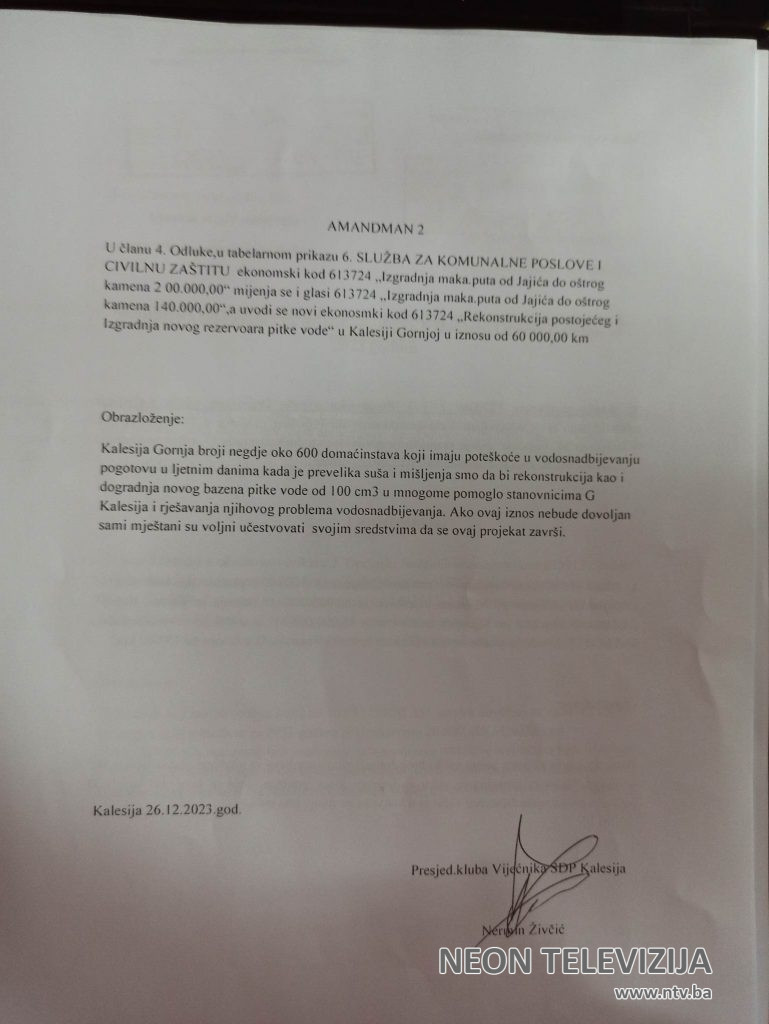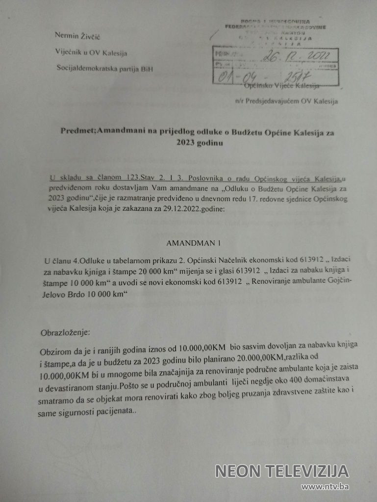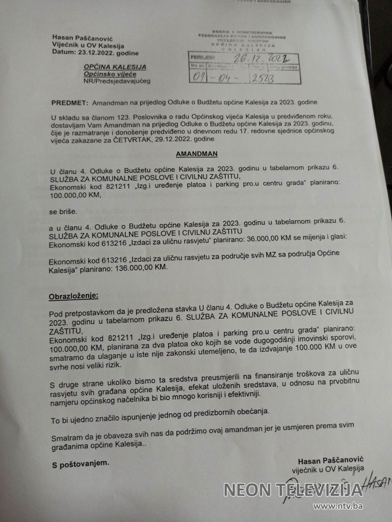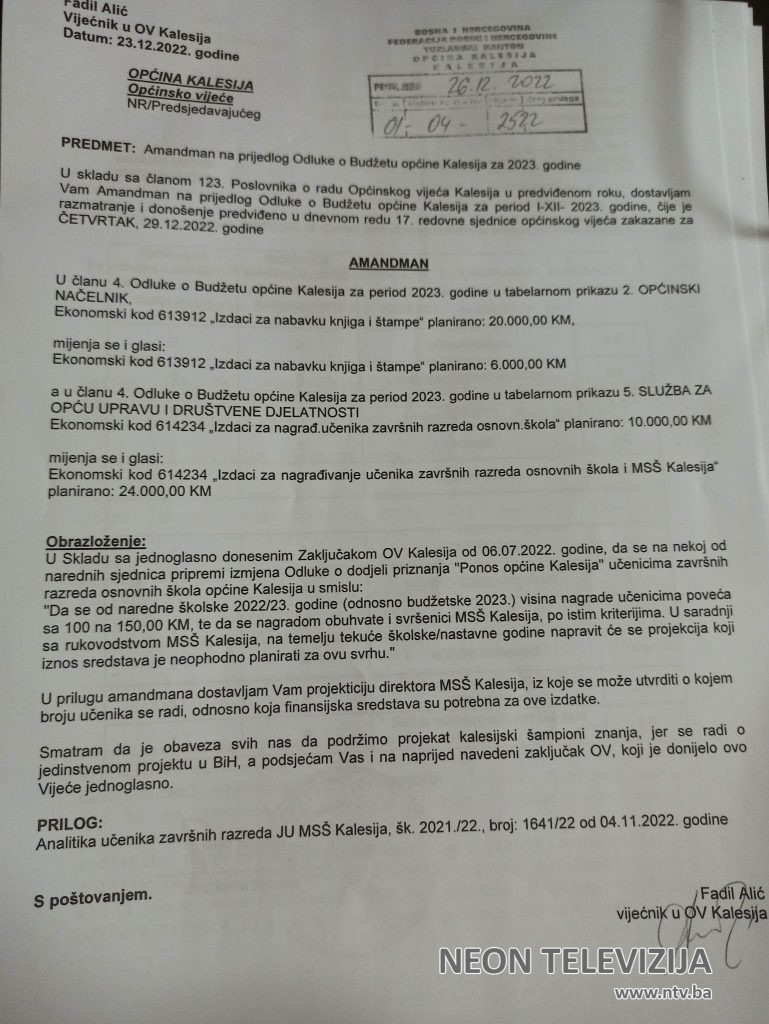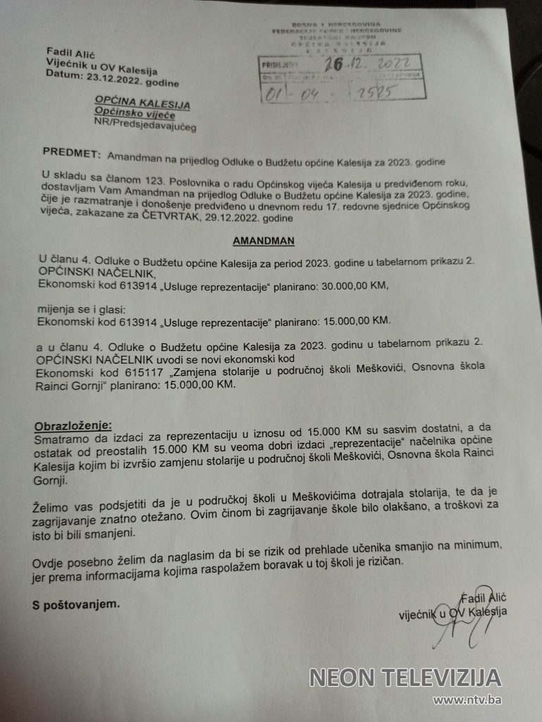 Alić je dostavio i Amandmane za Odluku o budžetu općine Kalesija za 2023. godinu. Njegov amandman nije usvojen.