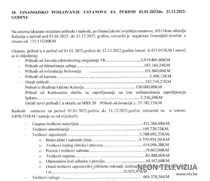 Dom zdravlja Kalesija u prethodnoj godini ostvarila je negativan finansijski rezultat od preko 127 000 KM.
