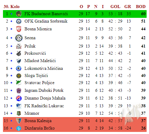 Pobjeda u posljednjoj utakmici sezone je imperativ za ekipu iz Kalesije, jer bi to značilo opstanak u ovom rangu takmičenja. U proteklom kolu “Bosna” je igrala neriješeno u gostima sa ekipom “Prokosovići”.