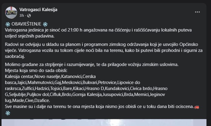 Vatrogasna jedinica je sinoć od 21:00 h angažovana na čišćenju i raščišćavanju lokalnih puteva usljed snježnih padavina.