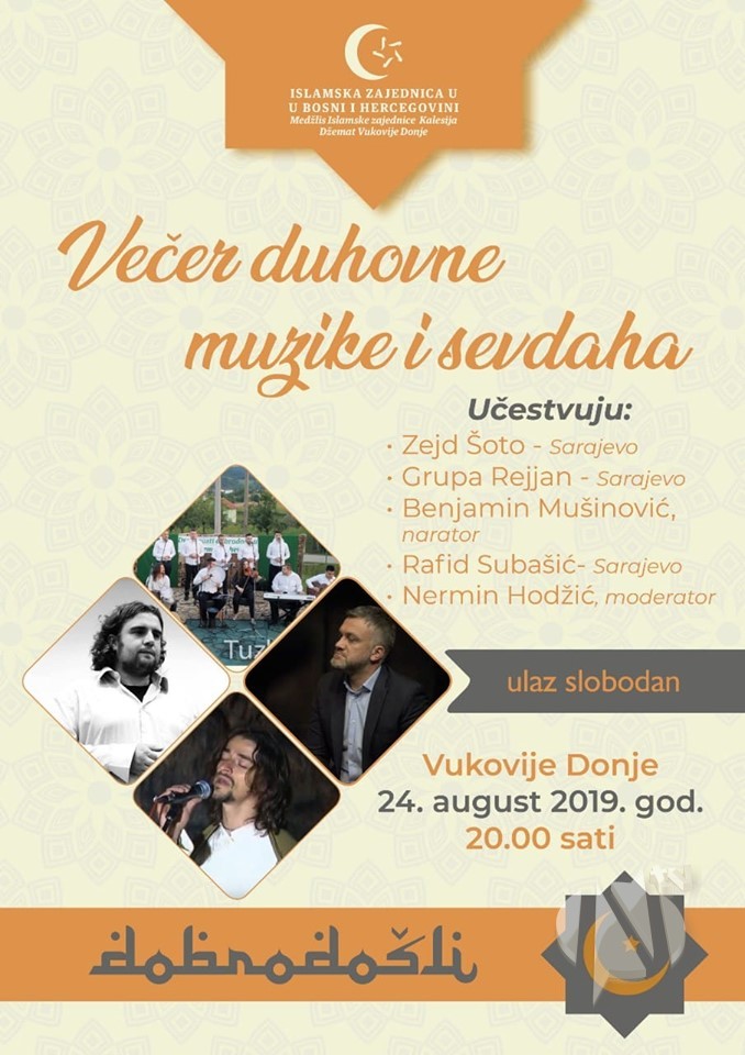 U subotu 24.augusta u Vukovijama Donjim bit će upriličeno “Veče duhovne muzike i sevdaha”. Program će se održati u haremu džamije u džematu Vukovije Donje sa početkom u 20:00 sati.