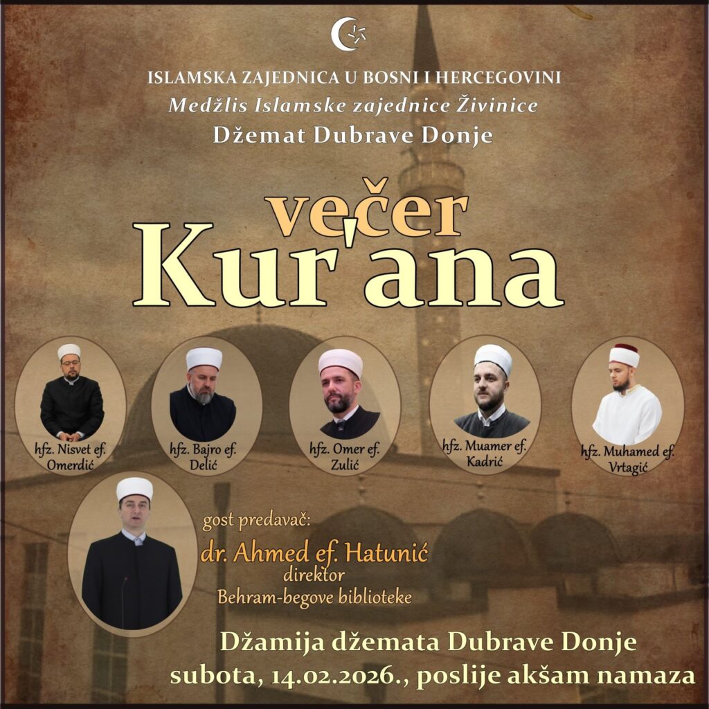 U organizaciji Medžlisa Islamske zajednice Živinice i džemata Dubrave Donje, u subotu, 14. februara 2026. godine, u džamiji džemata Dubrave Donje, bit će upriličena Večer Kur’ana.