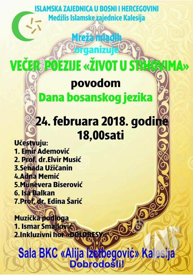 Večer poezije održat će se u BKC “Alija Izetbegović” Kalesija sa početkom u 18:00 sati.