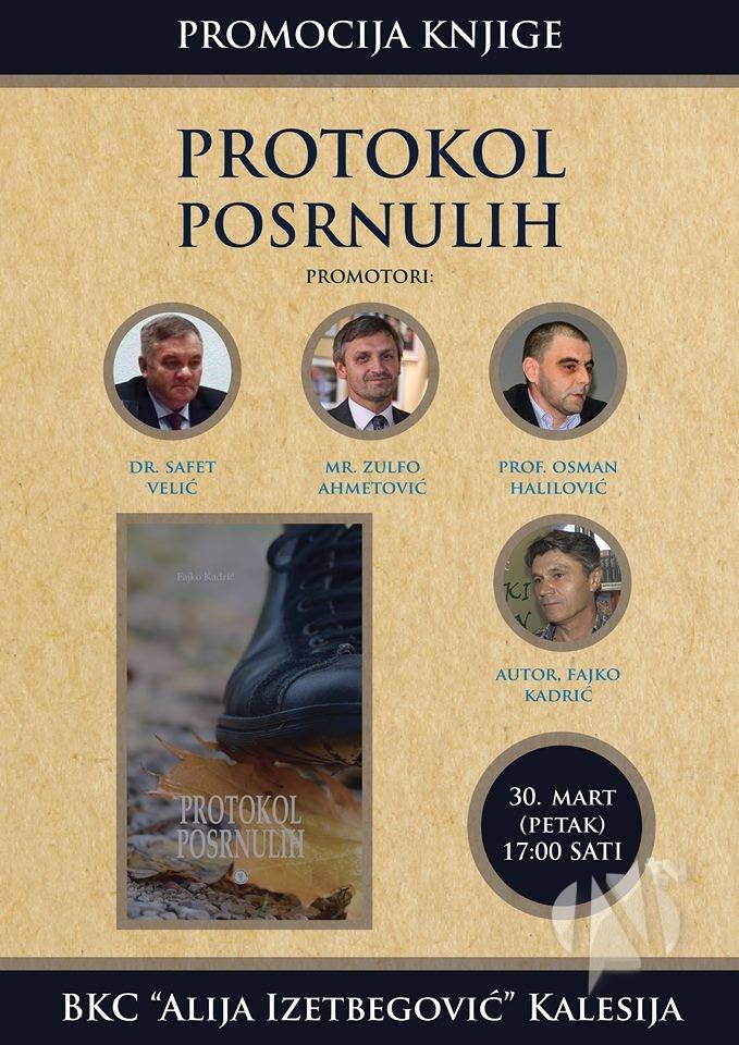 U petak, 30. marta, sa početkom u 17,00 sati, u sali kalesijskog BKC-a, bit će održana promocija romana „Protokol posrnulih“ autora Fajke Kadrića. Osim autora, o knjizi će još govoriti i dr. Safet Velić, mr. Zulfo Ahmetović i prof. Osman Halilović.