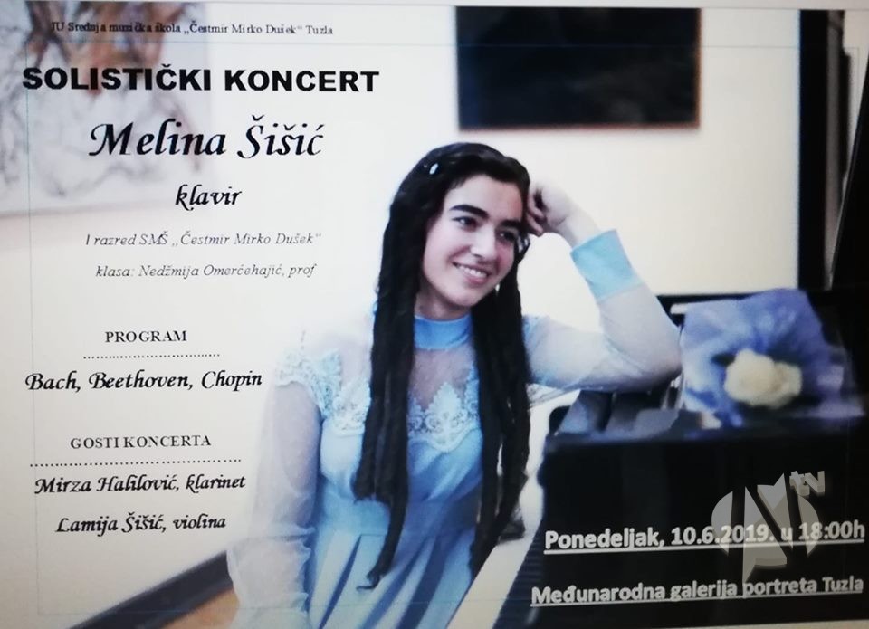 U Međunarodnoj galeriji portreta u Tuzli, večeras u 18:00 sati Kalesijka Melina Šišić održat će solistički koncert. Melin Šišić je učenica prvog razreda SMŠ “Čestimir Mirko Dušek” Tuzla u klasi profesorice Nedžmije Omerćehajić.