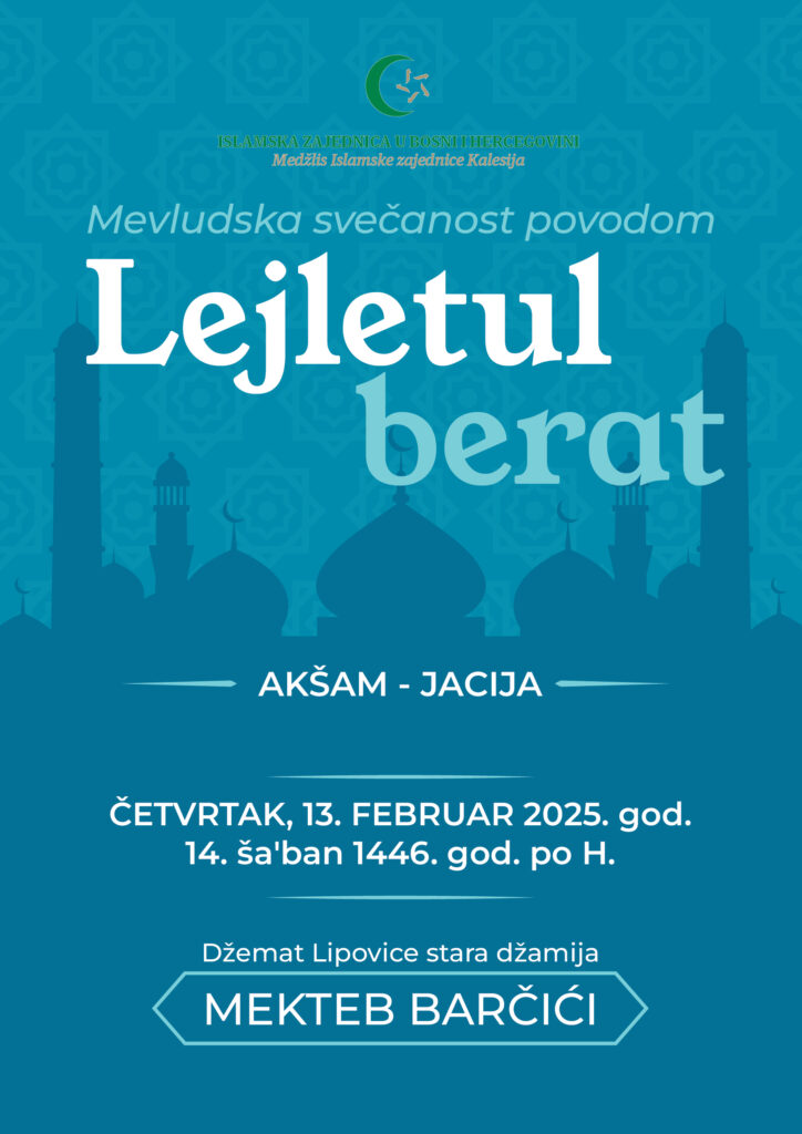 Medžlis Islamske zajednice Kalesija poziva sve zainteresovane na vjersku-mevludsku svečanost povodom Lejletul-berata, mubarek-noći koja podsjeća na skori dolazak šehr-i ramazana.