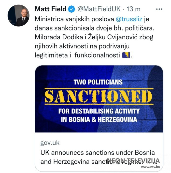 Vlada Ujedinjenog Kraljevstva je sankcionisala Milorada Dodika i Željku Cvijanović zbog njihovog narušavanja legitimiteta i funkcionalnosti Bosne i Hercegovine.