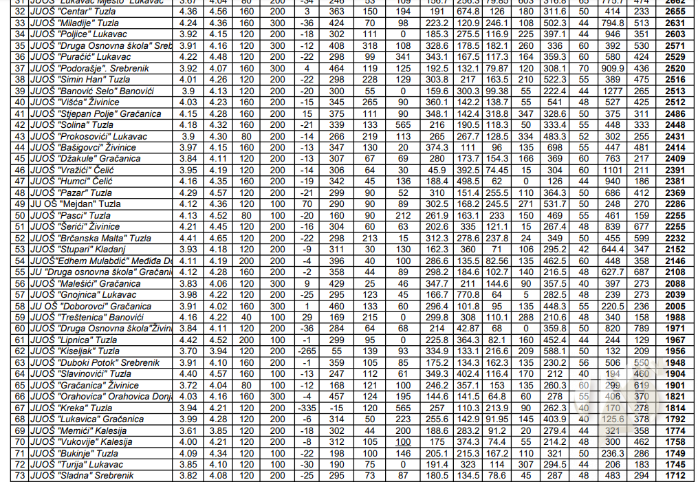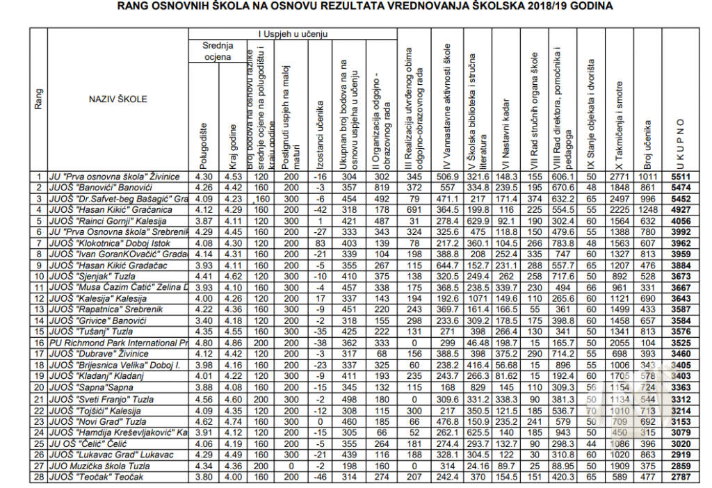 U ukupnom vrednovanju za ovu školsku godinu Prva osnovna škola Živinice najbolja je na Tuzlanskom kantonu, dok je OŠ “Rainci Gornji” zauzima 5 mjesto.