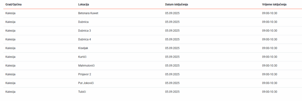 Iz Elektroprivrede su za petak (5. septembar) najavljeni kratkotrajni prekidi u snabdijevanju električnom energijom na području nekoliko kalesijskih naselja.