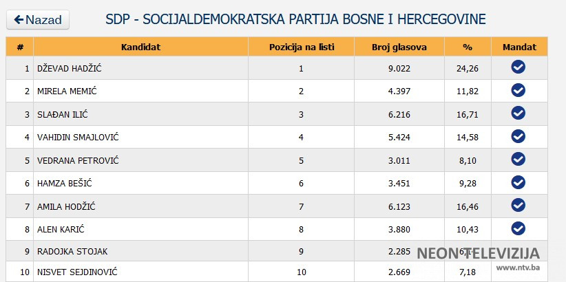 Na SDP-ovoj listi pored Dževada Hadžića koji je osvojio mandat kandidati su bili i Admir Šmigalović sa 2.414 glasova te Samra Hadžić sa 1.440 glasova.
