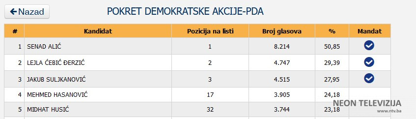 U PDA najbliža mandatu je bila Ismeta Hadžić sa osvojenih 1.229 glasova zatim Ferid Hodžić sa 1.669 glasova i Nedžad Džafić sa 1.443 glasa.