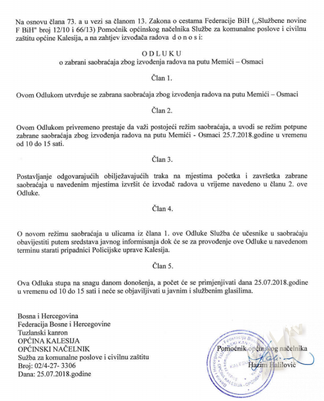 Zbog izvođenja radova na putu Memići-Osmaci iz općine Kalesija obavještavaju građane da će doći do zabrane saobraćaja na pomenutoj dionici puta 25.7.2018. godine u vremenu od 10.00 do 15.00 sati.