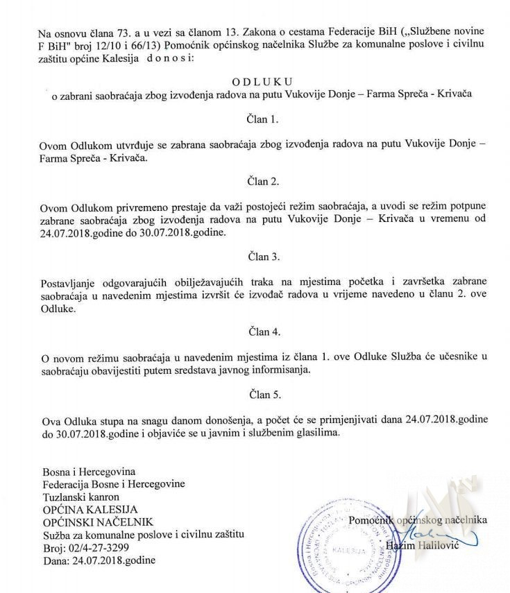 Zbog izvođenja radova na izgradnji puta Vukovije Donje – Farma Spreča – Krivača iz općine Kalesija obavještavaju građane da će u periodu od 24.07.2018.godine do 30.07.2018.godine biti zabranjen saobraćaj na ovoj putnoj dionici.