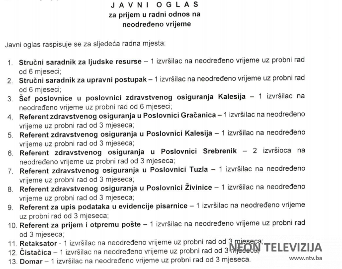 Zavod zdravstvenog osiguranja Tuzlanskog kantona objavljuje Javni oglas za prijem u radni odnos na neodređeno vrijeme za više radnih pozicija i više izvršilaca.