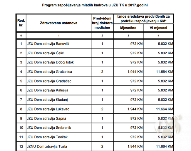 Cilj ovog Programa je obezbijediti mladi stručni kadar u javnim zdravstvenim ustanovama na području Tuzlanskog kantona koji se nalaze na evidencijama Službe za zapošljavanje Tuzlanskog kantona što će im omogućiti sticanje znanja i vještina, a zdravstvenim ustanovama nadomjestiti nedostatak kadra. Predviđena sredstva po doktoru medicine mjesečno su planirana u iznosu od 972 KM. Poziv ostaje otvoren dok svaka javna zdravstvena ustanova ne realizuje upošljavanje ukupnog broja doktora medicine koji je za nju odobren navedenim Programom, a najdalje do 30.06.2017. godine, saopšteno je.