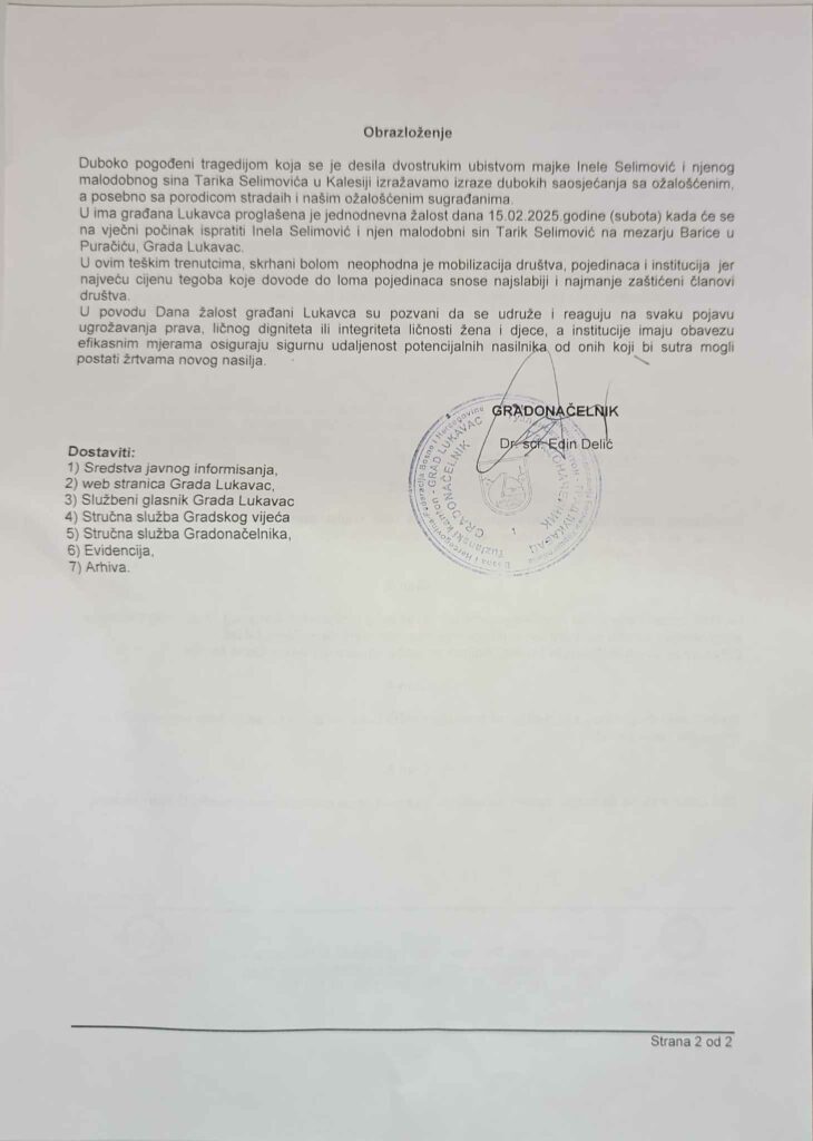 U ima građana Lukavca proglašena je jednodnevna žalost dana 15.02.2025.godine (subota) kada će se na vječni počinak ispratiti Inela Selimović i njen malodobni sin Tarik Selimović na mezarju Barice u Puračiću, Grad Lukavac.