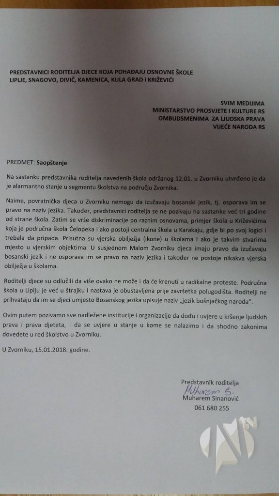 Roditelji su poslali i zvanično saopćenje za javnost svim medijima, ali i ministarstvu prosvjete Republike Srpske, Ombudsmenima za ljudska prava i Vijeću naroda RS.