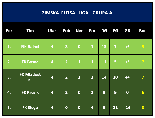Poznati su učesnici polufinala Zimske futsal lige iz grupe A. Ekipe Rainaca i Bosne su ubjedljivim pobjedama sinoć izborile prolazak u završni dio drugog izdanja ovog veoma zanimljivog takmičenja.