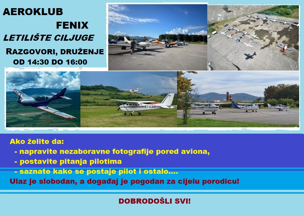 Aero Klub Fenix Živinice sa zadovoljstvom poziva sve građane na statičku izložbu aviona i druženje sa pilotima iz Bosne i Hercegovine i regiona, koja će se održati na aerodromu Ciljuge u subotu, 21. juna 2025. godine s početkom u 14:30 sati.