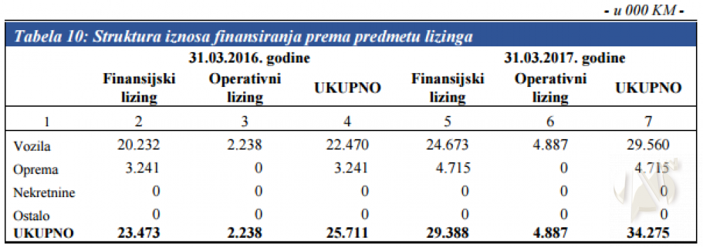 Što se tiče strukture iznosa finansiranja prema predmetu lizinga, firme i građani su najviše ugovora zaključili za kupovinu vozila, i to u vrijednosti od 29,56 miliona KM u prva tri mjeseca 2017. dok je 4,71 miliona KM vrijednost ugovora za kupovinu opreme na lizing.