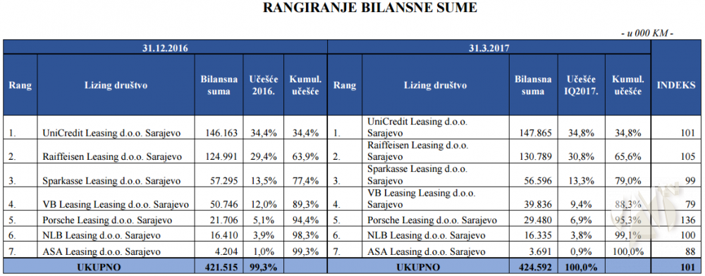 Od sedam lizing društava, samo četiri su vršila potpisivanje novih ugovora i to Porsche Leasing, Raiffeisen Leasing, Sparkasse Leasing i UniCredit Leasing. Ostala društva su obustavila zaključenje novih ugovora, izuzev sporadičnih slučajeva finansiranja izuzetih predmeta lizinga. Tržišno učešće lizing društava možete vidjeti u sljedećoj tabeli.